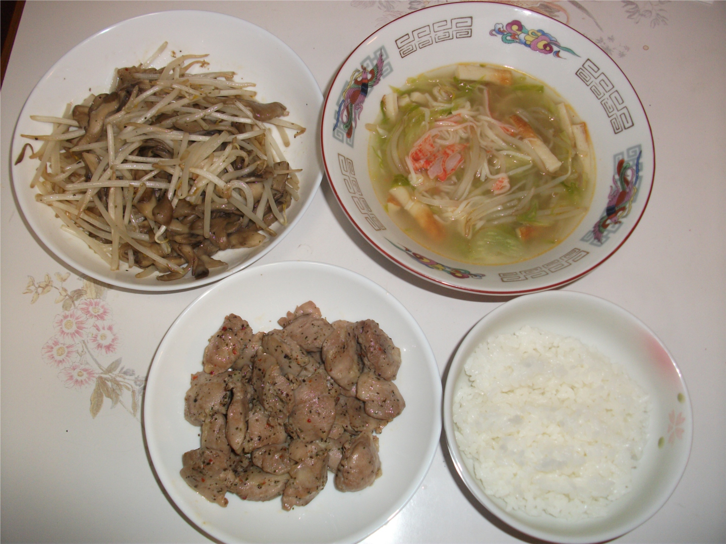 肉汁がいっぱい出たのでモヤシと舞茸を、塩とマヨネーズを足して炒めてみた。