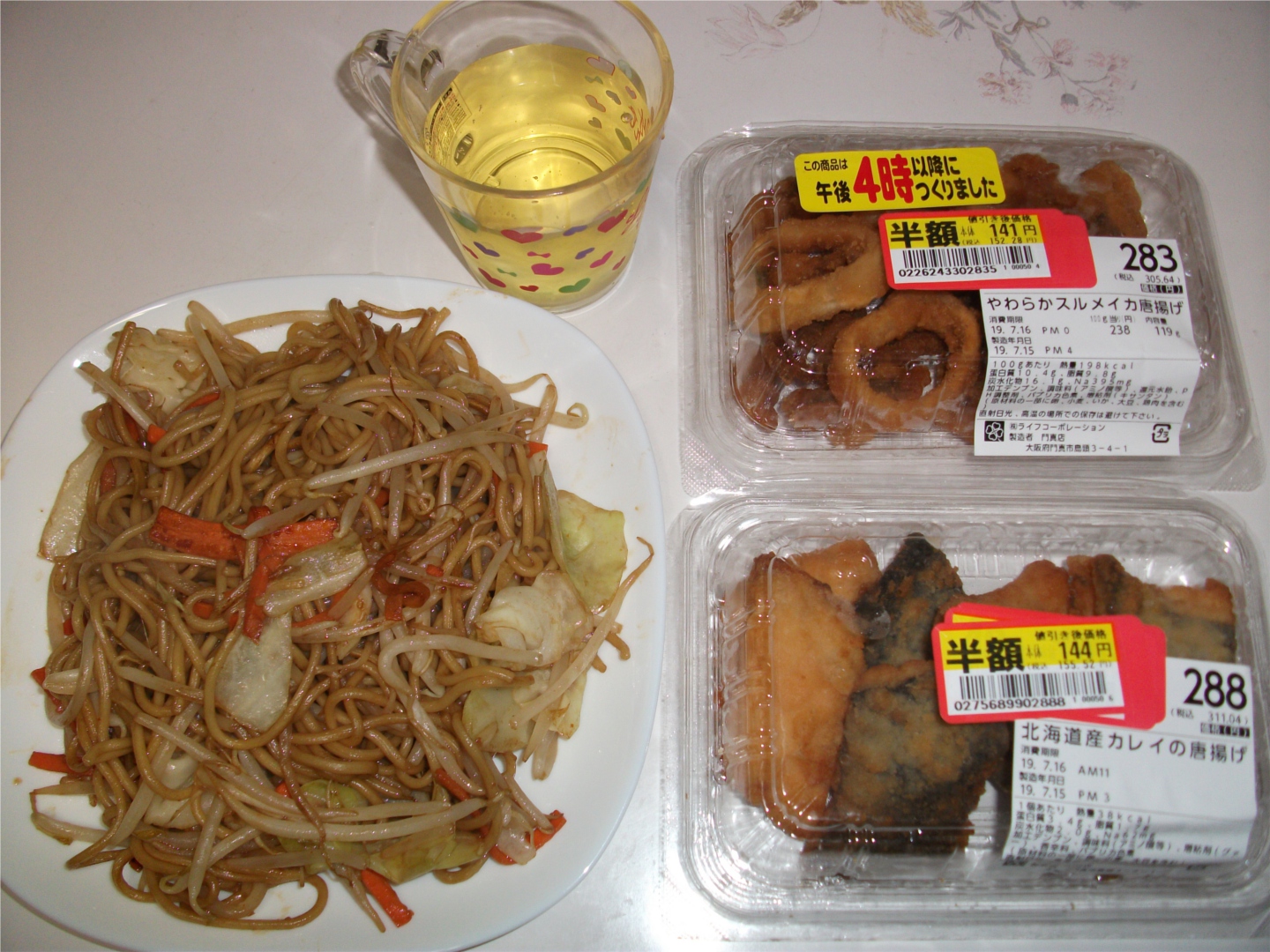 焼きそばと具も今日買った半額もの。