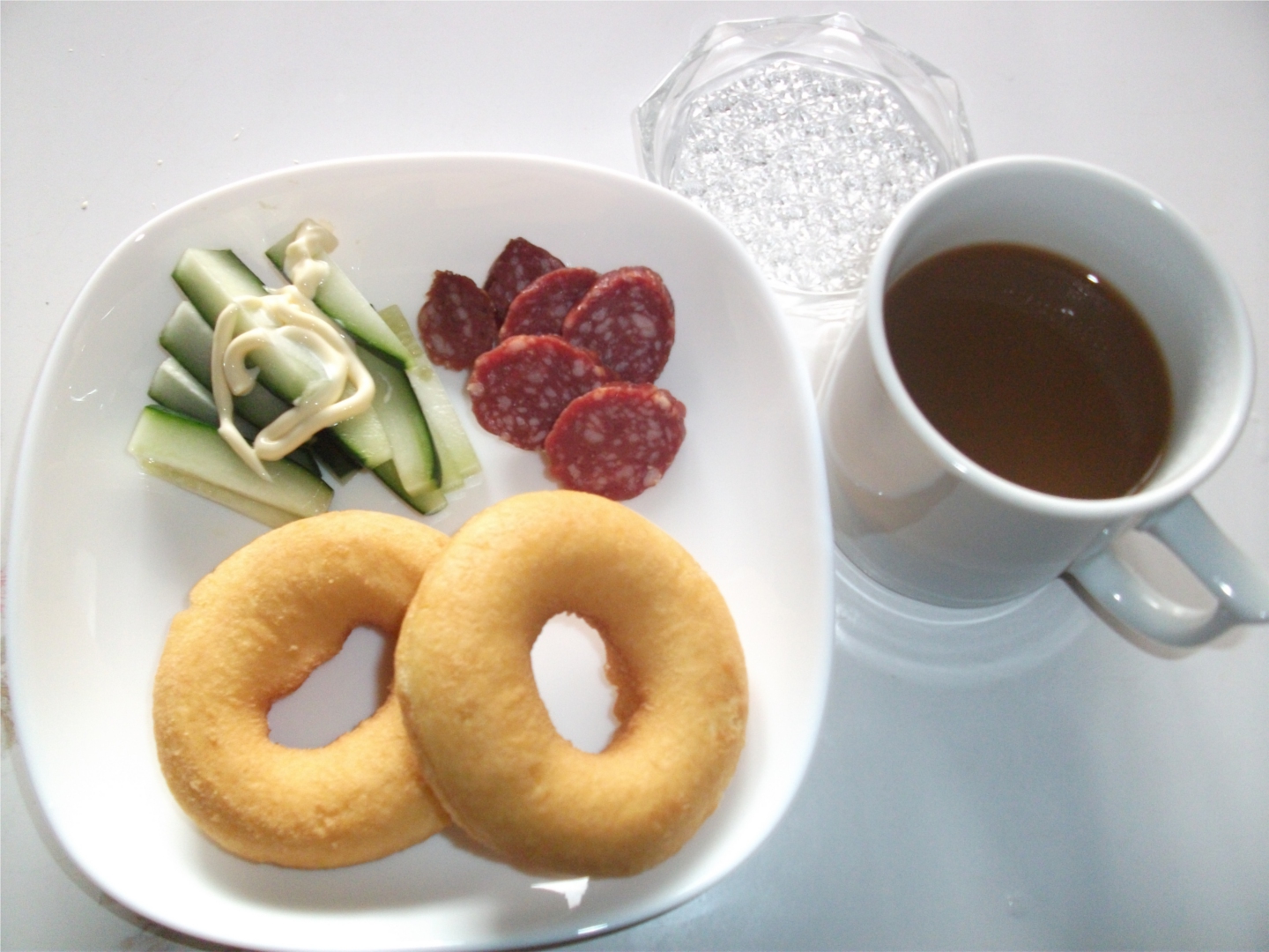 今日は付け合せが何もないのでキュウリとドライソーセージにしました。