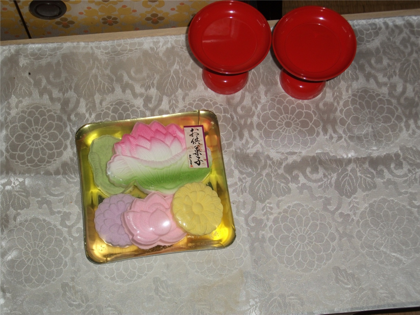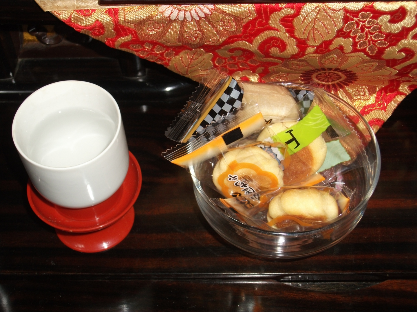 一口和菓子も少なくなってきたので塗鉢を片付け、砂糖菓子も冷蔵保管し白木の棚も片付けました。