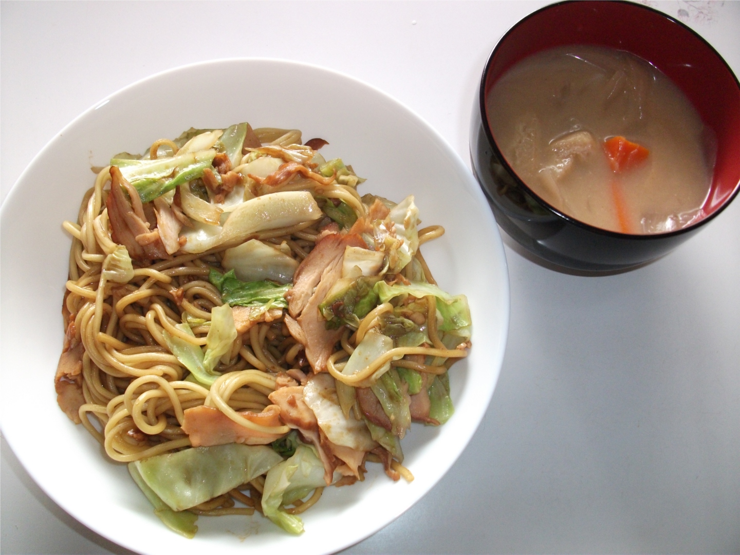 もやし19円、うどん15円、餃子68円、味噌汁(薄揚げ・玉ねぎ)+消費税、計 約130円