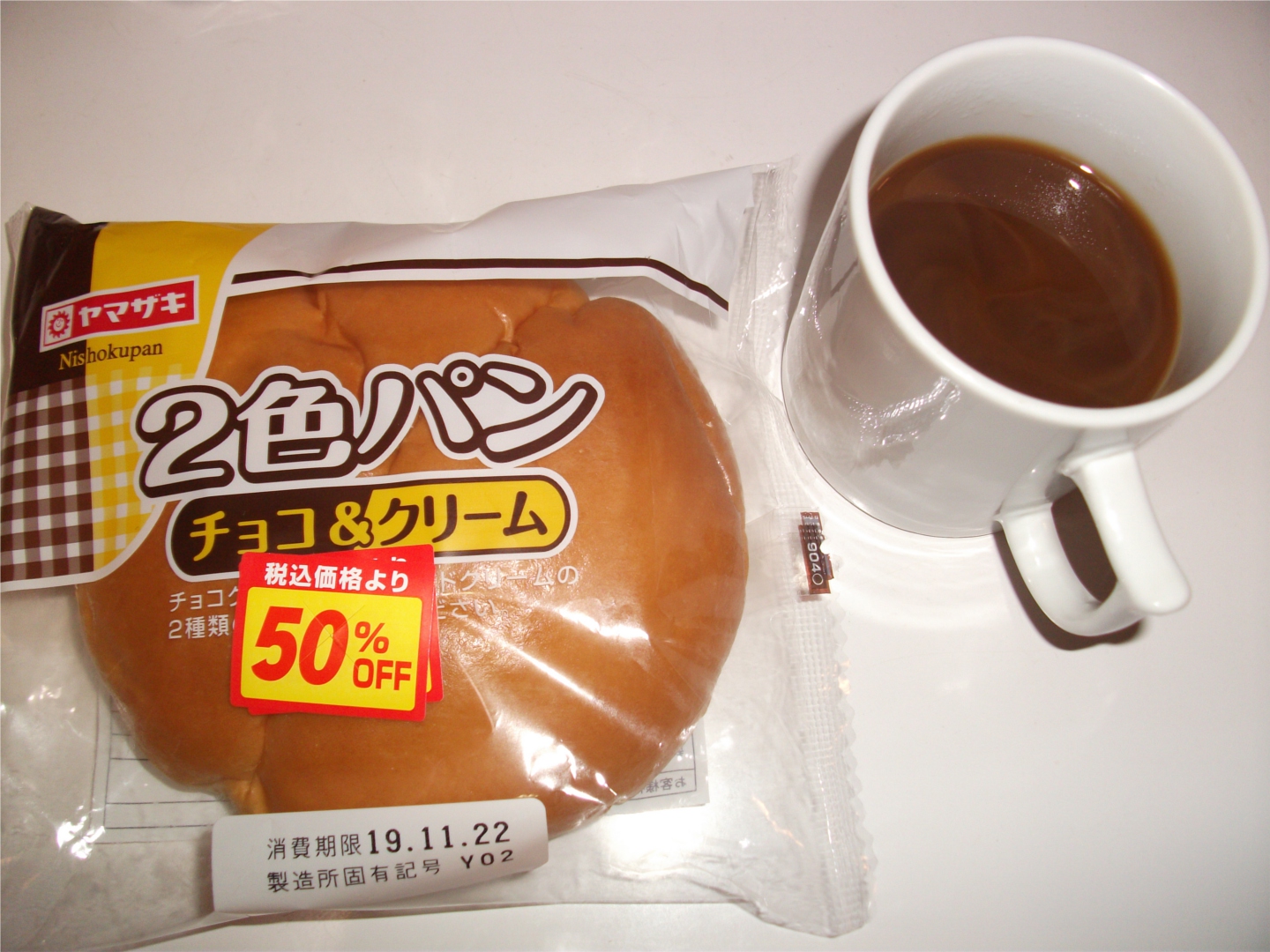 今、夕食としてチョコ&クリーム 2色パンを食べている。