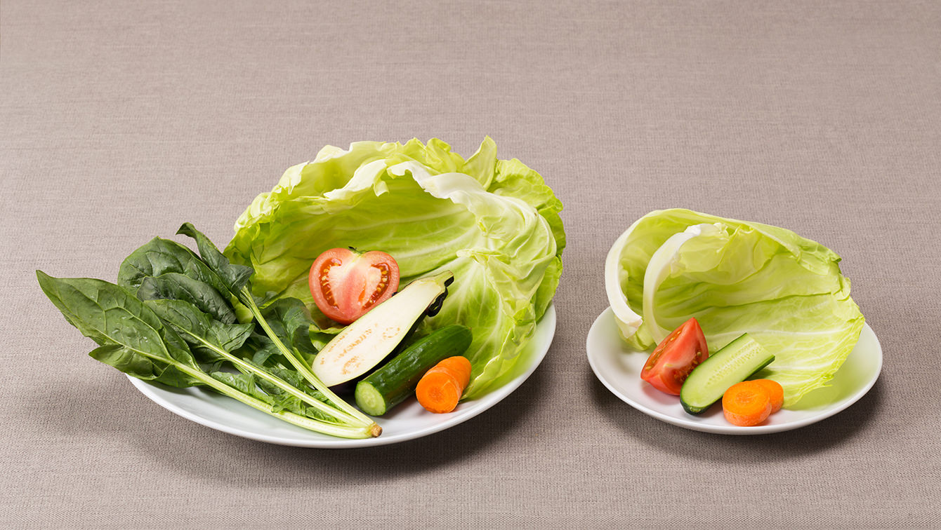 左の盛りつけが1日分の350g、右が1日3食の1食分となる。